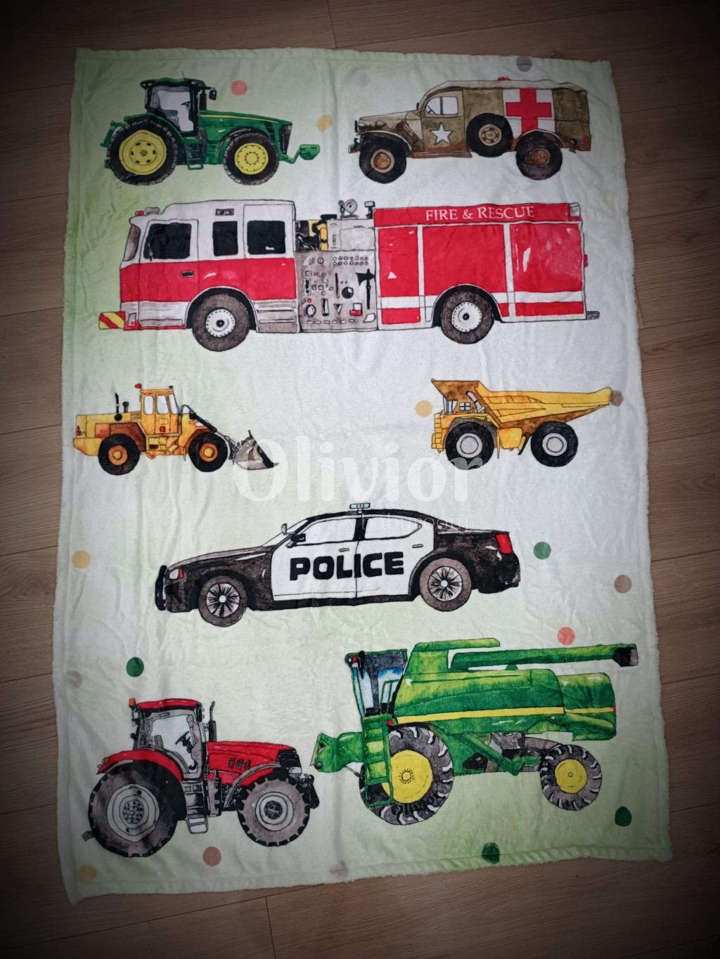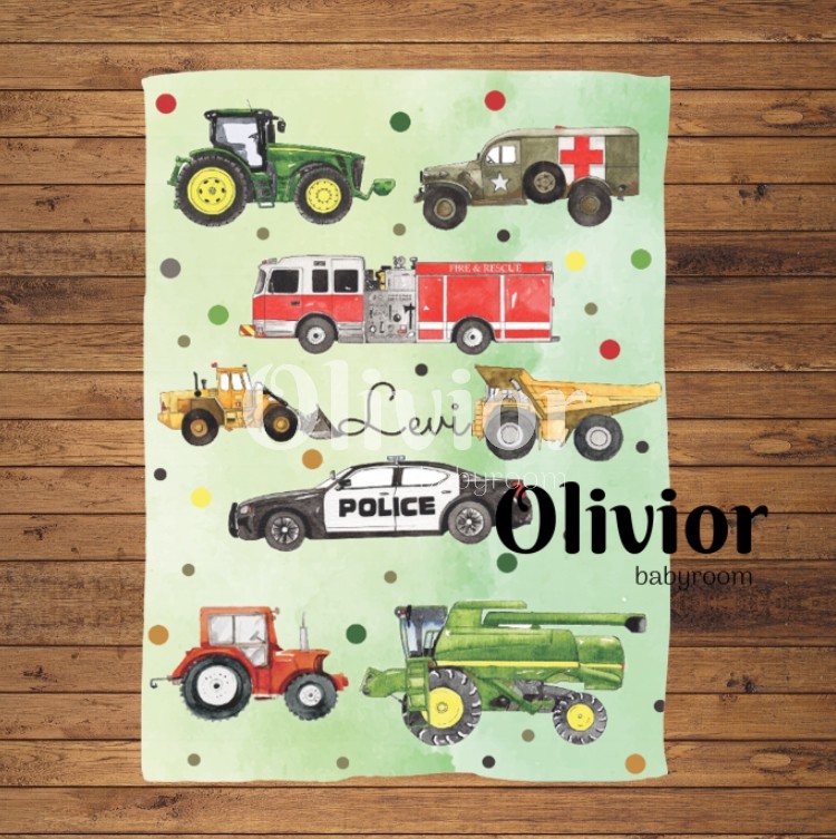 A pléden lévő járműveknek minden kisfiú örül, traktor, katonai jármű, tűzoltó autó, rendőr autó, markoló, bánya dömper, traktor, kombájn.