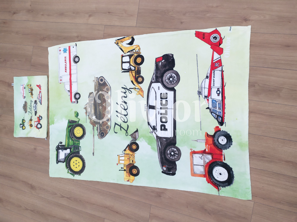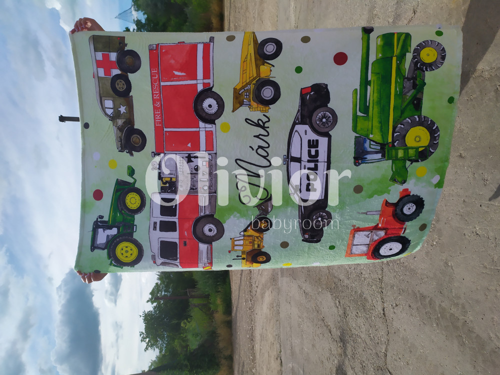 Traktor, tűzoltó, rendőr, markoló mintás pléd kisfiúknak puha wellsoft anyagból