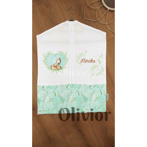 Őzikés oviszsák, óvodai vagy bölcsődei ruha tároló zsák, amibe könnyen be lehet csúsztatni a vállfát. Az elején nagy zseb található