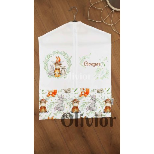 Bájos erdei állatkákkal díszített oviszsák, óvodai vagy bölcsődei ruha tároló zsák, amibe könnyen be lehet csúsztatni a vállfát. Az elején nagy zseb található